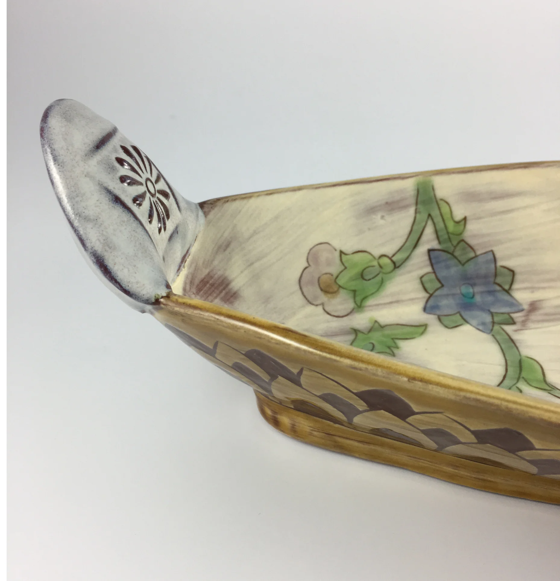 I use earthenware clay which is a low fire clay and has a rich history of decorative techniques and vessels made for everyday use. My work is hand built using moulds and templates which I have created. Slip is applied to the surface of the red clay. Once this layer is dry I am able to draw through the layer to the red clay below. Exposed clay surfaces on the bottom of pieces is covered with terra sigillata (literally means 'earth seal')This provides a beautiful sheen and seals the clay surface. The piece is then fired the first time, referred to as a bisque firing. Coloured glazes are painted into the design and a coat of thin clear glaze is applied to the entire surface. The final firing is at cone 03. All work is food safe and oven proof.